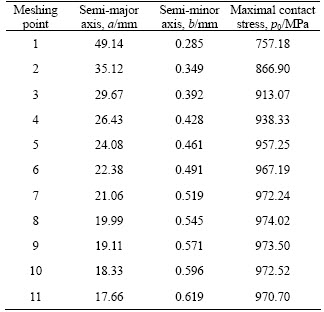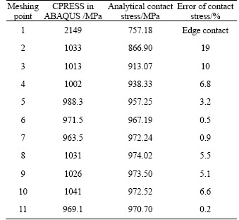 For the meshing points close to the addendum, their semi-major axes are longer, while their contact stresses are less. The meshing points 1 and 2 are close to the addendum, so the results are slightly unreliable. As shown in Fig. 6 and Table 4, the edge contact appears at meshing point 1. Due to the existence of edge contact,the analytical method fails, and the error in contrast is vast. The stress concentration happens in ABAQUS at point 1. At every meshing point except points 1 and 2, the errors of contact stresses are all below 10%, and the contact forces of two methods have identical value. It is proved that the two methods of contact stress calculation are verified by each other.