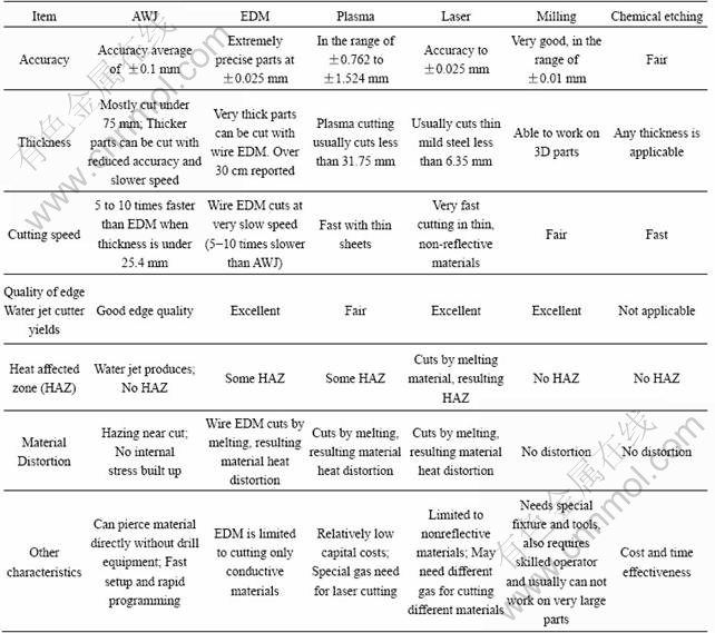 Table 1 Comparison of different machining such as water jet, wire EDM, laser, plasma, milling, and chemical etching