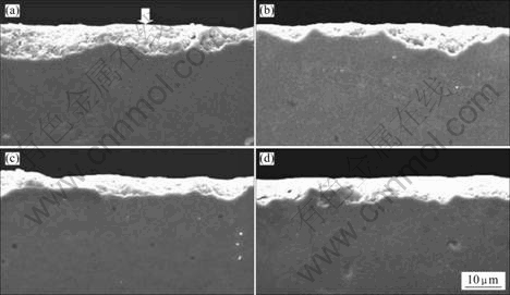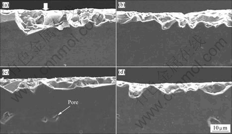 Fig.2 Subsurface damage layer of Al2O3-TiO2 for various wheel depths of cut (Larger arrow indicates machined surface) [16]: (a) 0.1 mm; (b) 0.5 mm; (c) 1.2 mm; (d) 1.5 mm