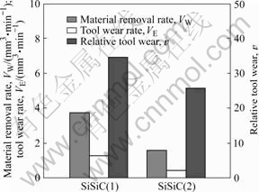 Fig.4 Material removal and tool wear under roughing condition (SiSiC) [30] (Test-conditions: tool, Cu(+); ie, 24 A; te, 25 μs; t0, 100 μs)