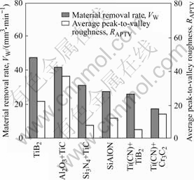 Electrical discharge machining uses spark erosion to remove small particles from electrically conductive material. The acceleration of EDM material removal rate increases with the discharge current and working voltage, but decreases with increasing pulse duration. EDM is especially well-suited for cutting intricate contour that would be difficult to produce with traditional machining. Advantages of EDM include high dimensional accuracy, good surface finish, lack of burr and little HAZ. Ti3SiC2 with excellent electrical conductivity and thermal conductivity is easily machined by EDM but high power is needed[25]. In order to obtain a high material removal rate and better surface roughness, LIU et al[26] suggested using a suitable chemical additive, dielectric strength, washing capability and viscosity of the machining fluid. They also suggested using a water-based emulsion as the machining fluid as harmful gas is not generated during machining, and the equipment is not corroded. Another suggestion by MUTTAMARA et al[27] to improve the material removal rate is by employing positive polarity in the case where the conductive layer is sufficient. Study on the EDM of conductive ceramics shows EDM performance is purely dependent on the level of intensity. It has been observed that increasing intensity will tend to increase surface roughness and electrode wear[28]. HU et al[29] investigated EDM on Ti3SiC2 using water as dielectic and found typical thermal shock cracks and loose grains in subsurface, which result in about 25% of strength degradation. Results of EDM reveal a wide variation in removal rates and surface finishes, as shown in Figs.4 and 5[30] shows the material removal and tool wear for EDM under roughing condition; and Fig.6 indicates the TiB surface after EDM[30].