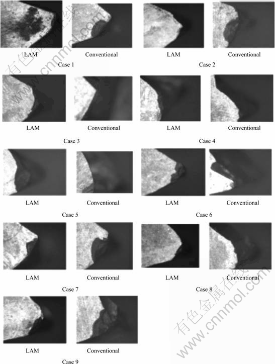 Laser assisted machining (LAM) is a thermal process. The laser is used as a heat source with the beam focused on the un-machined section of the workpiece. The addition of heat softens the surface layer of the material, so ductile deformation happens rather than brittle deformation during cutting. LAM power requirements depend largely on the material and the nature of the machining process[3]. In LAM, cutting force is obviously significantly reduced and the ease of cutting is increased accordingly, resulting in evident improvement in surface roughness[3]. The possibility of vaporizing material during LAM may cause surface problems due to its severity in much the same way as in discharge machining[15]. The advantages of laser are that it provides high speed and precise cut when cutting thin material; laser yields no burr and a little HAZ. LAM has demonstrated its ability to reduce cutting force and lower dynamic forces, less sharp segmented chip and smooth surface finish is produced[37]. It is suitable to cut non-reflection mild steel. LAM disadvantages include it requires high energy, high cost and must be conducted in a specify condition. The power of laser must be controlled properly to obtain a satisfactory result and a lot of power is needed to conduct this machining. CHANG and KUO[38] showed that LBM clearly appropriate for predicting the temperature distribution of difficult-to-machine materials during the LAM process. Tool wear is a major factor affecting the surface roughness of the workpiece. Fig.7 shows the comparison of tool wear in LAM with conventional machining[3]. They found that cutting resistance of processing aluminum oxide ceramics is extremely large, thus increasing the tool wear and affecting surface quality. TSAI and CHEN[39] found that generation of tensile stress was concentrated at the edge of groove-crack and induced the extension of the groove-cracks during LBM. BLACK et al[40] showed that surface glaze usually possesses a different linear expansion rate to the underlying substrate. The large thermal gradient due to laser beam causes the lower substrate to expand at a different rate, resulting in cracking of the glaze.