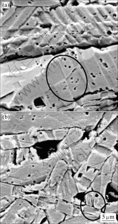 Thermal etch involves heating of polished ceramic specimens to around 200 ℃ of the sintering temperature. It is performed under argon in vertical tube furnace with silicon carbide hearth. The specimens are then annealed in vacuum or inert atmosphere and used primarily at high temperature[47]. Thermal etch is not normally applied to non-oxide ceramics owing to problems with oxidation. In principle it could be carried out under vacuum or inert atmosphere. From previous works, pressure-less-sintered β-SiC produced by sintering SiC powders was successfully etched[55]. COOK et al[55] successfully built a useful guideline in fabricating engineering ceramics. They found only SiC was able to successfully thermally etch and gave a low value of surface roughness. JARDIEL et al[56] tested Bi4Ti3O12 with HF solution under temperatures ranging from 25 to 50 ℃. They found that etching effect at 50 ℃ for 180 s showed the best etching effect. SEM micrograph showed thermal etching modified the morphology of the microstructure, where the shape of Bi4Ti3O12 changed from rounding plate-like grain to platelets under the action of the chemical agent, as shown in Figs.8 and 9[56].