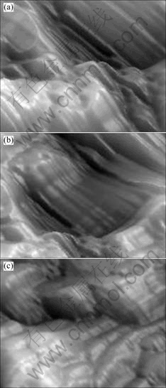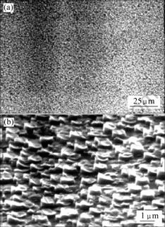 surface may be obtained when light intensity is high and solution concentration is low, where the reaction rate becomes limited by the KOH concentration and the diffusion of reactants to the surface[55]. KINDER and TAUSLEY[63] showed the surface roughness of GaN/SiC (0.2 μm) etched surface with decreased KOH concentration. By reducing KOH concentration from 0.04 to 0.02 mol/L, the surface roughness was significantly reduced, as seen in Fig.12(a) (surface roughness=2.5 μm while etching in 0.04 mol/L KOH). COOK et al[55] studied the different ways of preparing four engineering ceramics to determine the most effective etching methods. All materials then underwent different types of etching methods. COOK et al[55] summarized that silicon carbide (SiC), silicon nitride (Si3N4) and sialon, which were polished using a Buehler Motopol polisher and underwent different stages of diamond paste on a Textmet cloth etched excellently in molten-salt etch. Fig.12 shows secondary electron images of thermally etched SiC, Si3N4 and sialon[54]. Microstructure in Fig.12(a) showed a fibrous nature, consisting of elongated, high aspect ration SiC grains with finer grains between them. The molten-salt etch (in Figs.12(b) and (c)) removed the grain boundary phase and the Cr-rich particles, leaving the matrix untouched.