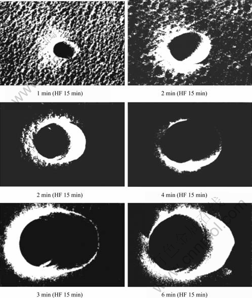 Fig.13 Close-up SEM micrographs showing that size of pits increase with increasing etching time in Secco etch[53]