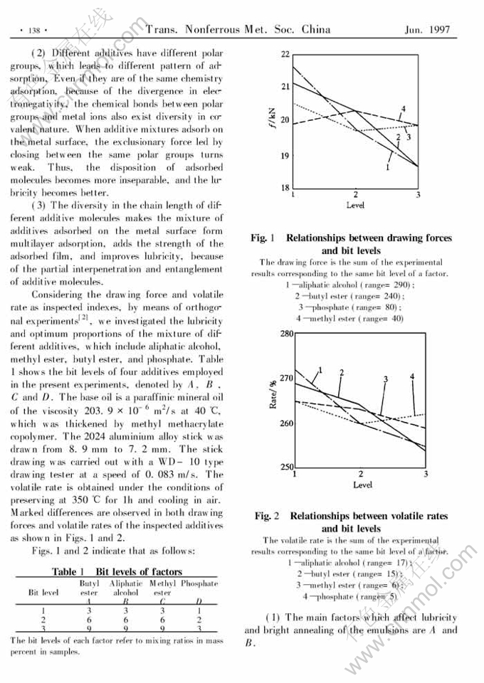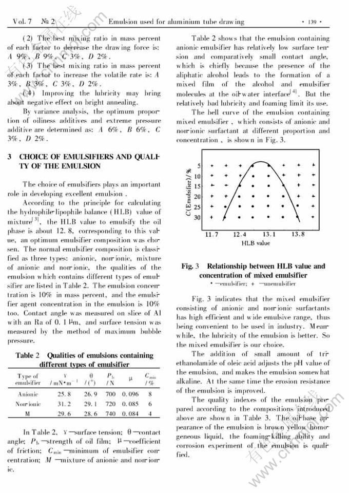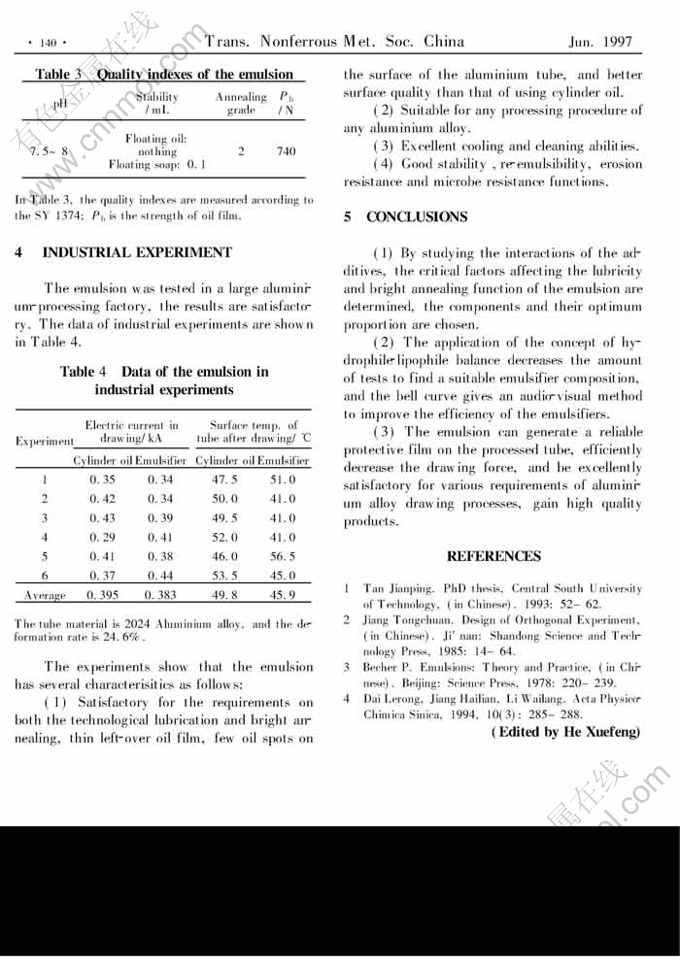 Abstract: The requirements on emulsions for aluminium tube drawing processes have been discussed. Apart from satisfying with the large deformation of processing, the studied emulsion can solve the contradications between the brightness feature and the good lubricity of emulsions, and make the surface of aluminium tubes very smooth after annealing.