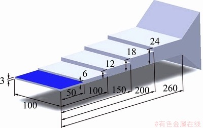 Al-Si-Cu alloy with the chemical composition of 10.55% Si, 1.79% Cu, 0.27% Mg, 0.852% Zn, 0.62% Fe, 0.043% Ti and balance Al (mass fraction) was used for the investigation. Five-stepped patterns with 50 mm each in size, having different thicknesses of 3, 6, 12, 18 and 24 mm with a whole length of 260 and width of 100 mm were designed and fabricated from polystyrene foam with a density of 20 kg/m3 (Fig. 1). The patterns were dipped into slurry prepared with a mixture of zircon flour and colloidal silica for 20 s, then left to drip dry for up to 24 h in a controlled environment in order for the pattern to be coated with a refractory layer. The viscosity of the slurry was measured at 20, 28 and 36 s using a Zahn cup No. 5. Silica sands with three different grain sizes of AFS 30, 60 and 90 were used for the mould making. A four-point clamping vibrating table was employed to compact and facilitate uniform distribution of the sands inside moulding flask. A horizontal vibration of 50 Hz was used for 30, 60 and 90 s. The alloy was melted in a low frequency induction furnace and poured at three different temperatures of 680, 720 and 760 °C.
