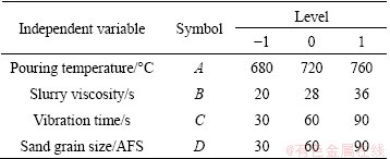 Design of experiment (DOE) methods has been widely used to determine significant design factors affecting the target responses and to establish empirical models representing the relationship between the significant factors. VIJIAN and ARUNACHALAM [9] used three-level orthogonal arrays “L934” to optimise squeeze cast parameters to produce Al-Si alloy castings having high quality surface finish. KUMAR et al [10] run Taguchi method and used “L9” orthogonal array to plan and analyze their experiments in order to optimize the tensile properties of Al-7Si alloy in evaporative pattern casting process. This method was also applied to optimizing the process parameters for welding of A319 aluminium alloy [11]. A five-factor, 2-level, 1/2 fractional factorial design with 4 centre points was used to identify the critical factors affecting the shrinkage porosity in permanent mould casting process [12]. Recently, DOE was employed to investigate the effect of some die cast machine parameters on the quality of LM20 aluminium alloy castings [13]. Reviewing literatures reveals that the majority of researchers explored various DOE methods for evaluating and optimizing the properties and manufacturing processes of aluminium alloys. However, there are very limited papers reporting the use of DOE methods in assessment of Al-Si alloy castings produced by LFC. Full-factorial design as a strong candidate in evaluating the significant process parameters can be employed to develop casting process by the evaluation of combined independent factors [14]. In this work, the effects of four important parameters of LFC, namely pouring temperature, slurry viscosity, vibration time and sand size as well as their interactions on porosity, surface quality and silicon spacing of thin-wall Al-Si-Cu castings were studied using full-factorial DOE.