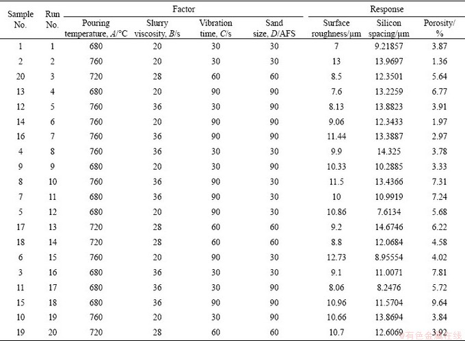 Table 2 shows the actual values of the selected factors used for producing the cast samples. The results of measurements including surface roughness, silicon spacing and porosity values as the three important properties of the cast samples are also shown in this table. It provides the input information for DOE analysis of the effect of interacted process parameters on the production and evaluation of the cast samples.