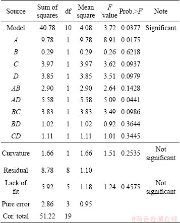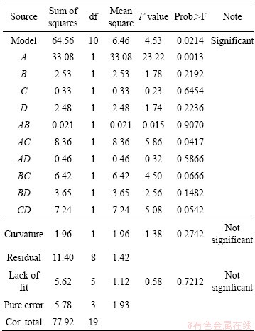 P=4.64-1.18A+0.40B+0.16C+0.49D+0.25AB-0.68AC-0.48CD (4)