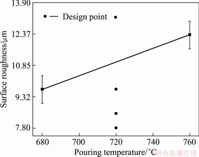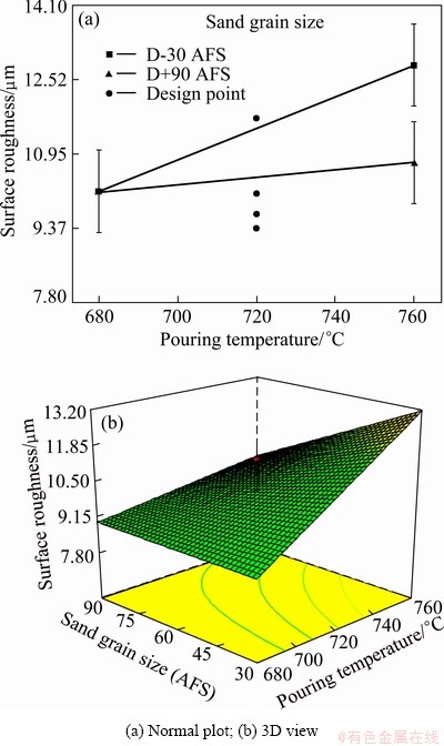 Fig. 4 Effect of interaction of poring temperature and sand size on surface roughness of thin section of cast samples
