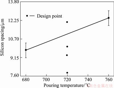 Fig. 6 Effect of pouring temperature and vibration time on silicon spacing