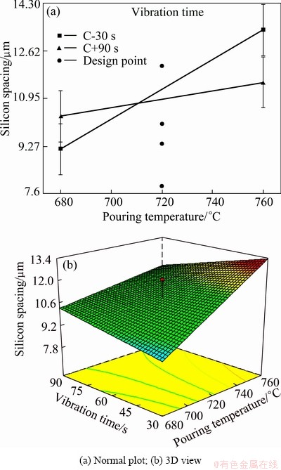 The result of the interacted effect of pouring temperature and vibration time on silicon spacing of the alloy is shown in Fig. 6(a). It can be seen that elevating pouring temperature increased the silicon spacing of the cast sample regardless of the vibration time. This result is in good agreement with that reported by DING et al [19]. However, the rate of increment was significantly lower for the longer vibration time (90 s). In other words, samples cast in shorter vibrated moulds suffered from larger silicon spacing when the higher pouring temperature was used. It is worth noting that at 680 °C an inverse behaviour was observed and finer silicon microstructure was developed. This result implies that better mechanical properties may be obtained if lower pouring temperature and mould compactness are used. In fact, the foregoing condition can contribute to the higher solidification rate which accompanies smaller silicon spacing. The 3D plot of the interaction shown in Fig. 6(b) illustrates the higher impact of pouring temperature on silicon spacing of the cast samples compared to that of vibration time. Although interaction between pouring temperature and vibration time has a significant effect on the silicon spacing, the magnitude is quite low as compared to the pouring temperature. Therefore, shorter vibration time together with lower pouring temperature is preferable in LFC of Al-Si-Cu alloy as it is expected to provide finer silicon structure in cast alloy.