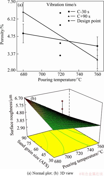 Figure 9(a) illustrates the interaction result of the pouring temperature and vibration time which was found as the other significant factor based on the DOE analysis.