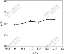 Fig.1 Effect of volume fraction of hydrogen inhibitor (φ) on cathodic current efficiency (η) of Zn electrodeposition