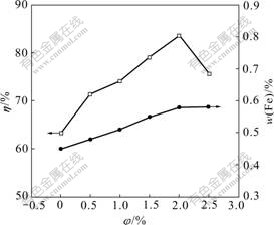 Fig.2 Relationship between volume fraction of hydrogen inhibitor and current efficiency and mass fraction of Fe in coating