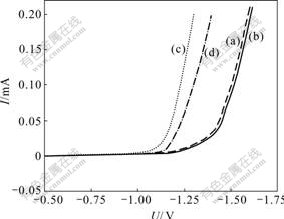 Fig.3 Effect of hydrogen inhibitor on stable polarization curves of Zn and Fe deposition: (a) Zn; (b) Zn and hydrogen inhibitor; (c) Fe; (d) Fe and hydrogen inhibitor