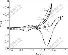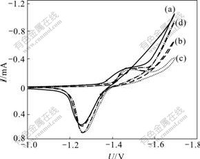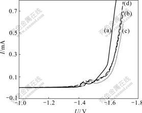 Fig.6 Effect of volume fraction of hydrogen inhibitor on cyclic voltammetric curves of Zn-Fe alloy codeposition: (a) 0; (b) 1.0%; (c) 2.0%; (d) 3.0%