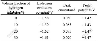 The effect of hydrogen inhibitor on cyclic voltammetric curves of Zn-Fe codeposition is shown in Fig.6. There exists a maximum value of negative movement of hydrogen evolution potential, and an optimum volume fraction of hydrogen inhibitor. There is a minor effect of hydrogen inhibitor on cathodic and anodic peak potentials. However, when the volume fraction of hydrogen inhibitor is added from 0 to 3.0%, anodic peak current of Zn-Fe alloy codeposition increases from 0.54 to 0.57, 0.65 and 0.66 mA, respectively, which illustrates that the alloy codeposition is promoted through restraining hydrogen evolution.