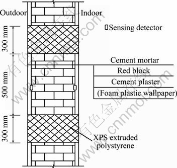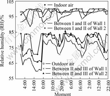 TENWOLDE [5] reported the experimental results for moisture movement in wood construction walls in a warm humid climate. Nine different test walls were constructed on the campus of Lamar University in Beaumont, Texas, USA. SHAKUN [6] studied the causes and control of mold and mildew in Florida hotel-motel sites. The primary cause of the interior moisture damage was a direct result of the infiltration of warm moist outdoor air into the wall spaces. Moisture from this warm moist air would condense due to the air-conditioning having cooled the building wall surfaces below the dew point temperature. He also concluded that the use of vinyl wall-coverings traps moisture inside the wall cavities, which results in high moisture levels in the building materials. HOSNI et al [7] carried out a series of experiments about the building heat and moisture transfer on the concrete block. The experiment was divided into two phases. The main objective of Phase-1 was to evaluate heat and moisture transfer by diffusion. In Phase-2, in addition to the diffusion through the test walls, air infiltration was added by maintaining a pressure gradient of 12.4 Pa during the test period. Data were collected at the end of the Phase-2 testing to determine the rate at which the test walls would dry out without infiltration present. Thus, he concluded that the external surface vapor retarder will reduce the moisture transferred into the wall, however, it is still less than that reduced by interior wall protective layer. SU [8] tested the temperature and relative humidity at the interface between block and gypsum board under different environmental conditions for different time. She found that in hot and humidity conditions, when the relative humidity of the outside environment of experimental wall increases, the temperature and relative humidity at the interface between gypsum board and brick close to indoor have almost no change, the temperature at the interface between gypsum board and brick close to outdoor decreases and the relative humidity increases at this place with the outdoor temperature decreasing. ROELS et al [9] performed a round robin experiment on the determination of the hydrothermal properties of porous building materials to generate a dataset for benchmarking numerical models.