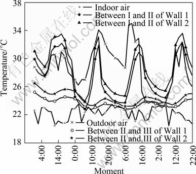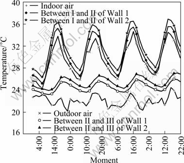 Figure 3 shows the temperature distribution in sunny day. It can be found that the temperature curves at the interface between cement mortar and red brick are coincident to the outdoor temperature curve. This results from the large thermal conductivity of the cement mortar. The temperatures at this interface are often higher than the outdoor temperatures. This is because of the solar radiation in daytime, and because of the heat of the brick spread out in nighttime. The temperature curves at interface between red brick and cement plaster are similar with indoor temperature. They are mainly affected by the indoor temperature. However, during the daytime, the temperature curves have a slight fluctuation due to heat transfers from outside to inside. And it can be found that the temperature gradient concentrates on the red brick layer and the temperature at cement mortar layer is mainly affected by the outdoor temperature and cement plaster layer by the indoor temperature.