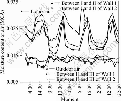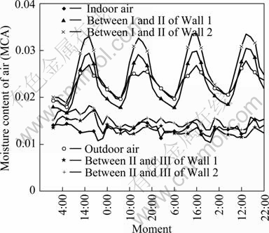 Figure 4 shows the distribution of moisture content of air in sunny day. By comparing Fig. 3 with Fig. 4, it can be found that the variation curves of moisture content in the envelope and the temperature curves are similar. It can be concluded that the moisture content of air in the envelope changes in the analogous way as the temperature. The temperature increases at the interface between cement mortar and red brick cause the saturated water vapor pressure at this interface to increase and relative humidity to decrease. Hence, the liquid water in the pore evaporates and results in the moisture content increasing with temperature. For the great vapor resistance of red brick, the moisture content of cement plaster layer is mainly affected by indoor humidity but not outdoor humidity.