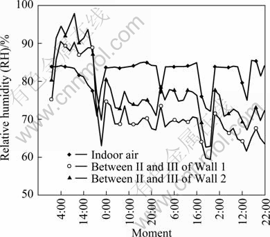 To monitor the moisture transfer, one new sensing detector was placed at the interface of I and II, and another at the interface of II and III, as shown in Fig. 2. At the same time, two temperature and humidity sensors were situated near the two sides of the envelope, respectively, which were used to monitor the temperature and humidity of the air near the envelope.