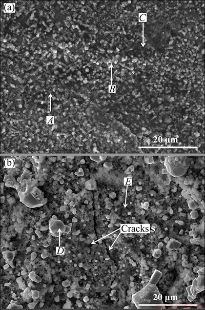 Fig. 4 Surface morphologies of specimens after hot corrosion in mixture melts at 700 °C (a) and 800 °C (b) for 1 h
