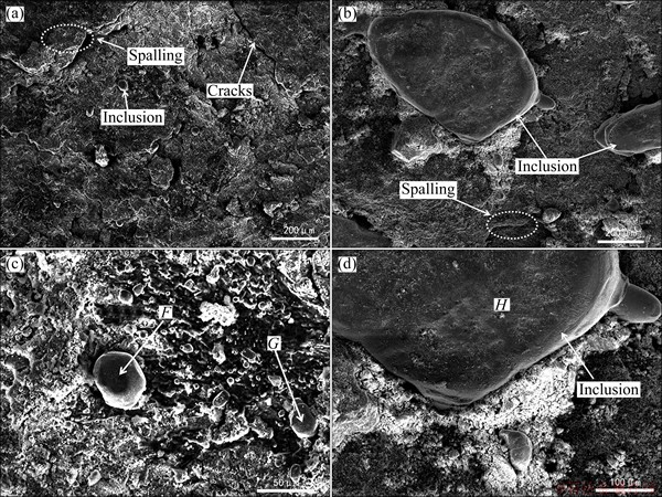 Figure 6 shows the surface morphologies and corresponding high magnification images of specimens corroded at 700 and 800 °C for 20 h. At 700 °C (Fig. 6(a)), the cracks are presented and some inclusions are exposed. Combining the results of XRD (Fig. 3) and EDS analysis (Table 2), it can be deduced that the inclusions are Ni3S2. The cracks originate from the inclusions, as shown Figs. 5(f) and 6(a), which eventually leads to the corrosion scales spalling off. Compared with the corrosion at 700 °C, the inclusions formed at 800 °C are big, and the specimen suffers from serious corrosion attack, as shown in Figs. 6(b) and (d).