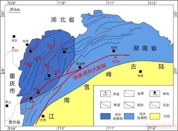页岩气是一种新型清洁、高效非常规天然气资源,主要以游离态赋存于页岩孔隙和裂隙中,或者以吸附态赋存于干酪根和黏土矿物表面,属于典型的“自生自储自盖、原地成藏”模式[1-2]。在美国“页岩气革命”推动下,我国南方油气勘探迎来新的机遇和挑战,2016年四川盆地五峰组—龙马溪组页岩气产量超50亿m3,预计2020年,全国页岩气产量将达300亿m3[3-4]。湖南是一个“缺煤、无油、少气”的能源匮乏省份,能源短缺长期制约社会经济发展。然而,相比四川盆地,湘西北永顺、龙山、保靖等区块五峰组—龙马溪组多年来勘查缺乏实质性成果,部分学者质疑其聚集条件及含气性。CHEN等[5]围绕四川盆地、五峰组—龙马溪组页岩气地质特征进行了研究。赵文智等[6]从沉积、热演化、盖层、构造等角度进行研究,认为四川盆地五峰组—龙马溪组页岩气聚集条件优越。李博等[7]提出盆地外复杂构造区五峰组—龙马溪组页岩的5大主要核心评价指标体系,包括优质页岩厚度、TOC质量分数w(TOC)、脆性矿物质量分数、含气性及保存条件等,并指出盆地外区块仍具有勘探潜力。国内学者根据四川盆地焦石坝五峰组—龙马溪组勘探实践,提出“中国式”复杂构造区高演化海相页岩气“二元”富集规律:深水陆棚优质泥页岩是物质基础;良好保存条件是关键[8-12]。范二平等[13-17]认为湘西北五峰组—龙马溪组w(TOC)高及热演化程度高,发育多种类型的孔隙,埋深适中,具有形成页岩气藏的良好潜力。李海等[18]认为湘鄂西地区经历了复杂多期构造运动,保存条件成为页岩气富集的关键。湘西北地区五峰—龙马溪组页岩虽然与四川盆地同属上扬子板块,但其地质条件有2个显著特点:1) 位于晚奥陶世—早志留世深海陆棚相东缘,富有机质页岩特征横向及纵向变化较大;2) 燕山—喜山期构造运动强度大,形成现今复向斜构造格局,五峰组—龙马溪组仅残存于孤立向斜核部,影响页岩气的富集和保存。目前,专门针对湘西北五峰组—龙马溪组页岩气地质特点、保存条件以及含气性特征等方面研究较少,导致对其聚集条件认识不足,严重制约勘查进展。为此,本文作者对其进行研究。