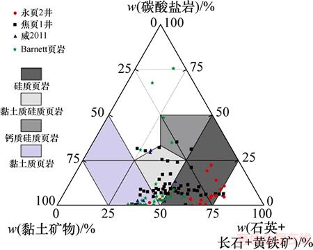 矿物成分是页岩储层评价和研究的主要内容之一。商业开发的页岩必须具备高脆性矿物(质量分数>40%)、低黏土矿物(质量分数<30%)的特征[25]。永页2井五峰组—龙马溪组页岩19块样品XRD分析结果表明:矿物以石英、黏土矿物为主,含有少量碳酸盐岩、长石、黄铁矿等;石英质量分数为34.6%~62.2%,平均为47.9%;黏土矿物质量分数为14%~54.2%,平均为26.9%;碳酸盐岩矿物质量分数为0~22.7%,平均为6.8%;黄铁矿质量分数为0.7%~14.3%,平均为4.5%。黏土矿物以伊/蒙混层为主,质量分数为36%~95%,平均为75.9%。伊利石、绿/蒙混层次之,其矿物成分与焦页1井、威201井的成分类似,见表2。将石英+长石+黄铁矿、碳酸盐岩以及黏土矿物质量分数作为三端元,制作三角图,五峰组—龙马溪组主要为硅质页岩[28](图4)。与Barnett页岩相比,五峰组—龙马溪组具有更高硅质质量分数,易于在水力压裂过程中形成复杂网状缝隙,大幅度提高储集空间及渗流能力。