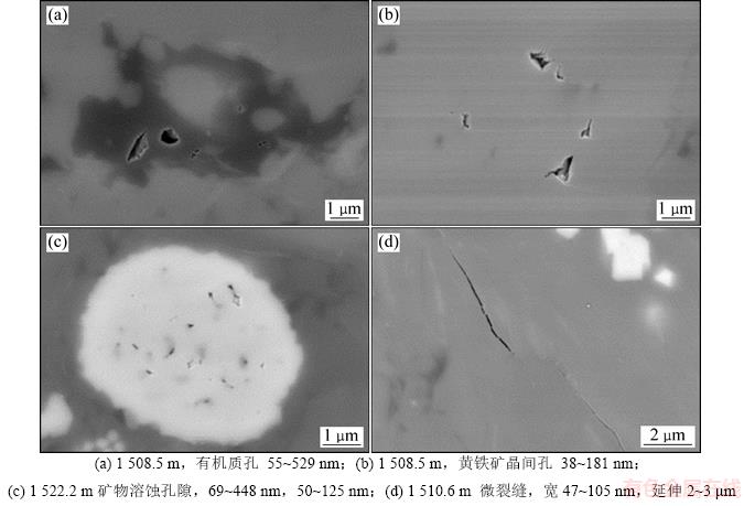 微裂隙可能与微沉积构造或后期成岩等作用有关,其一般为微米级(图5(d))。在低基质孔隙页岩中开放型微裂缝成为控制产量的主要因素[1]。