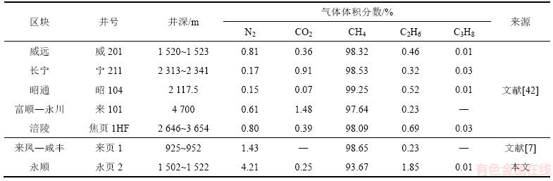 永页2井五峰组—龙马溪组页岩气中以甲烷为主(平均体积分数超过90%),含有少量乙烷和丙烷,与已获得工业开发的四川盆地长宁—威远、涪陵等区块相近(表3),具有良好含气性,且游离气体积分数高,有利于后期开发[40-42]。