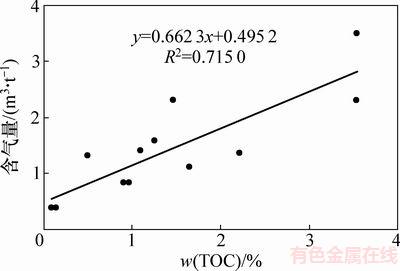 Fig. 8 Relationship between gas content and w(TOC) in Yongye 2 Well