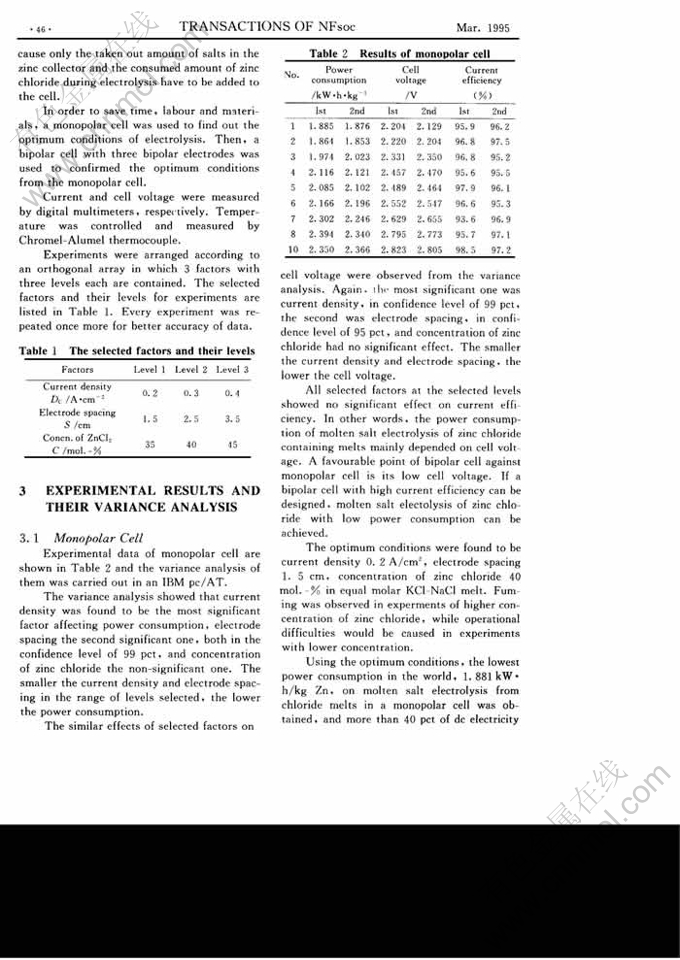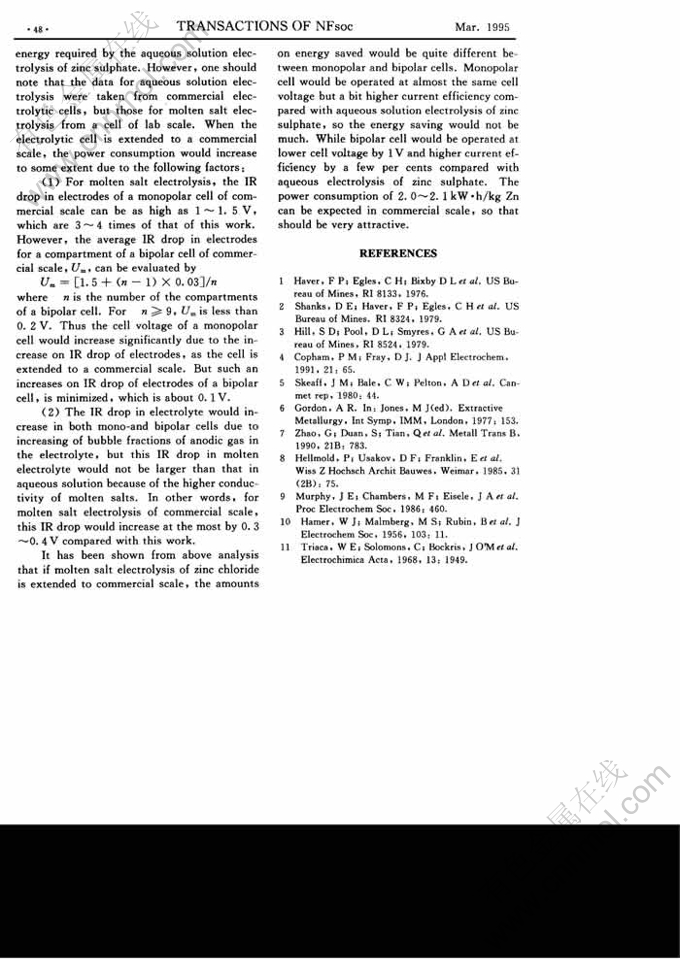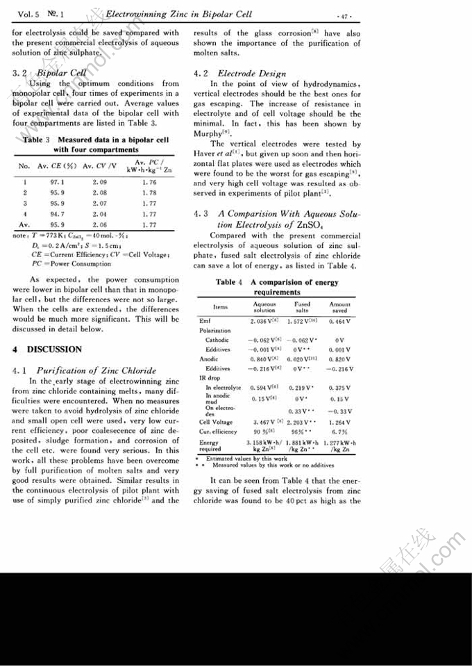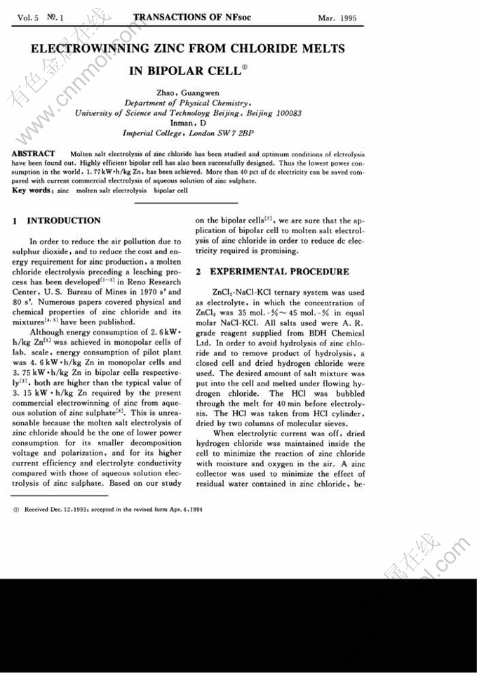 Abstract: Molten salt electrolysis of zinc chloride has been studied and optimum conditions of elctrolysis have been found out. Highly efficient bipolar cell has also been successfully designed. Thus the lowest power consumption in the world, 1.77kW·h/kg Zn, has been achieved. More than 40 pct of dc electricity can be saved compared with current commercial electrolysis of aqueous solution of zinc sulphate.