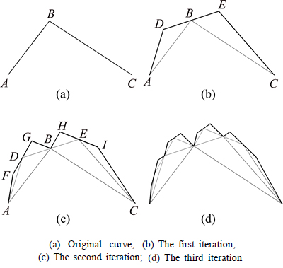 The fractal interpolation principle is shown in Fig. 1, with three different iterations from Figs. 1(b) to (d). The fractal interpolation is a fractal curve, and the curve is self-similar.