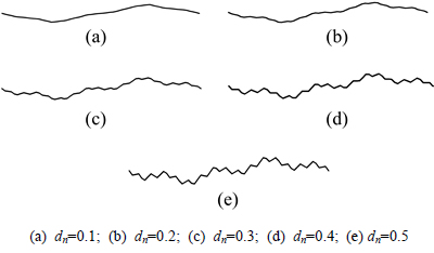 was used, in which Wn is the affine transformation in R2 and the attractor is the fractal graphics with interpolation points [(0,2), (1,1.8), (2,2), (3,2.2), (4,2)]. Based on the principle and method of fractal interpolation mentioned above, the software MATLAB was used to obtain the fractal curves with different vertical scaling factors (Fig. 3).