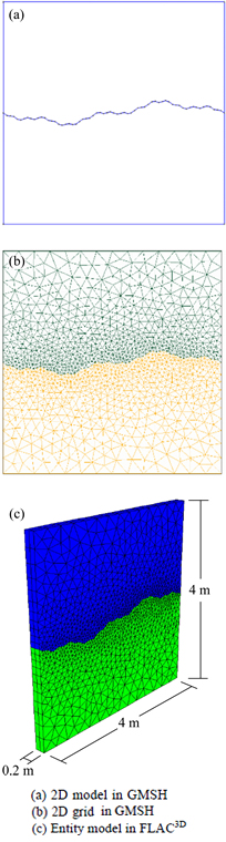 3) The interface program between GMSH and FLAC3D is written by using MATLAB. Then the .msh file can be rewritten into a .flac3d file easily by using the interface program. All the 2D models can be expanded to 3D models (see Fig. 4(c)) in this program.