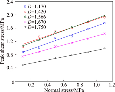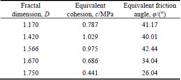 principle (Table 4) when the relationship between the normal stress and peak shear strength of the fractal surface can be described by a linear equation. The equivalent cohesion and friction angle have greatly improved compared with the initial values used in the model of the joint surface (cohesion c=0.1 MPa and friction angle φ=24.2°). That is, the strength parameters are influenced easily by fractal dimension of jointed rock masses.