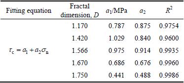 The fitting parameters and correlation coefficients for the five values of fractal dimension used in the model are shown in Table 3. The data show that the relationship between the normal stress and peak shear strength of the fractal surface can be described by a linear equation.
