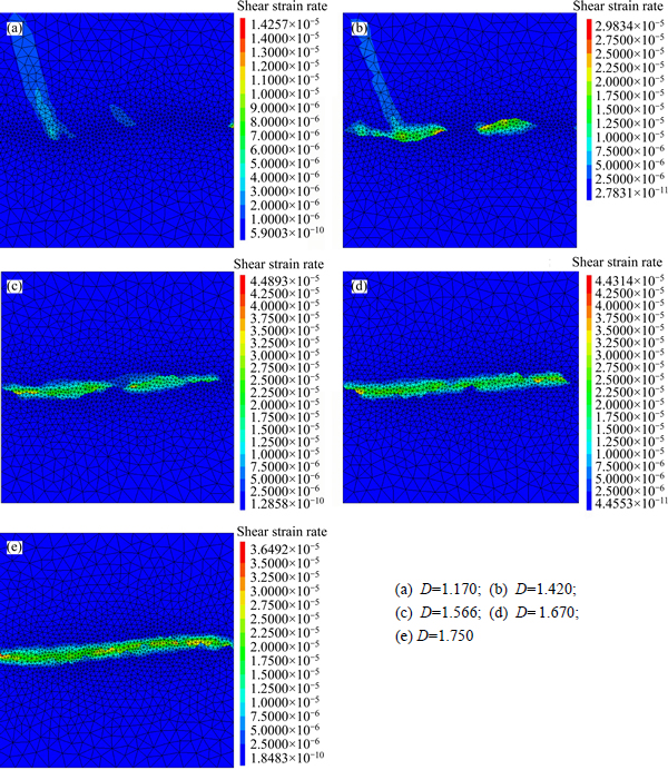 Figure 9 shows the max shear strain rate of the rock mass with different fractal dimensions at the normal stress of 0.3 MPa. As shown in Fig. 9(a), when the joint surface is smooth, relative sliding mainly happened between the jointed rock masses on both sides, and almost no significant shear deformation.