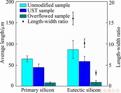 As shown in Fig. 2, the microstructure in the overflowed position is greatly refined, more importantly, the primary and eutectic Si are modified to particles in this position. The effect of refinement in the overflowed position is more remarkable than that with normal UST. The fast cooling rate, intense ultrasonic impact and vibration during solidification may be responsible for the microstructure evolution in the overflowed position.
