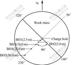 Therefore, the relative position between the monitoring points and the most dominant joint set with strike of 140? is shown in Fig.1.