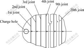 For estimation purpose, a schematic diagram of the Mandai test showing the relative position between the field monitoring points and the joints in the rock mass is shown in Fig.2. The explosion load is applied to the boundary of the borehole. The monitoring points are supposed to be along the radial line normal to the joints. Table 3 lists the numbers of joints that the compressional wave crosses before reaching the monitoring points.