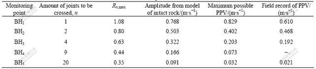 The maximum possible PPV corresponding to a monitoring point is the product of the estimated maximum rebound ratio Rn,max by the amplitude of the compressional pulse wave corresponding to the same monitoring point from the model of intact rock. The amplitude of the wave at any point for the case of intact rock can be determined using Fig.3(It is noted that the amplitude from Fig.3 is for the input wave with unity amplitude. Therefore, the amplitude value from Fig.3 is multiplied by 3.07, i.e. the amplitude of the input wave in Mandai test). Table 6 lists the estimated maximum possible PPVs and the field records.