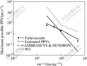 The estimated maximum possible PPVs from the prediction model and the field-recorded PPVs are compared in Fig.4. The horizontal axis in Fig.4 represents the scaled range (rm-1/3), where r is the radial distance, from the explosion source, m; m is the charge mass, kg. The solutions from two available empirical formulae (WU formula and AMBRASEYS and HENDRON formula) are also included in Fig.4. AMBRASEYS and HENDRON[12] suggested an empirical formula as: PPV=11.45(rm-1/3)-2.8, for (rm-1/3)<4.14 and PPV= 2.08(rm-1/3)-1.6, if (rm-1/3)≥4.14; while WU[13] suggested PPV=1.8(rm-1/3)- 2.5.