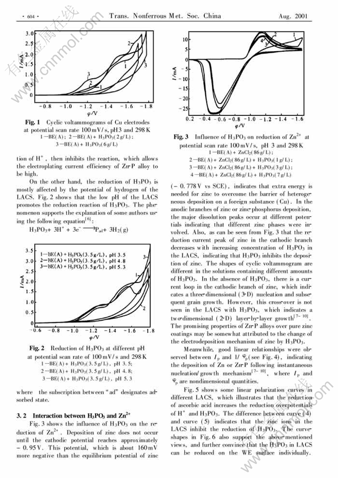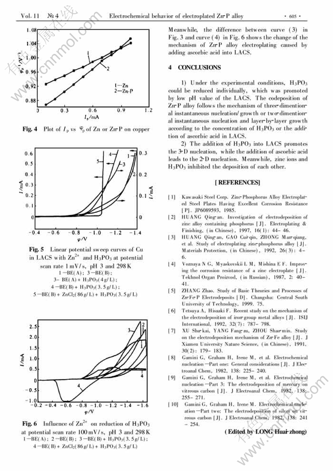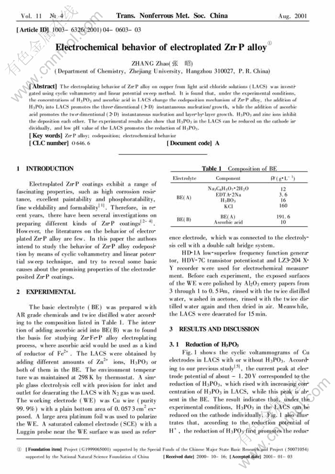 Key words:Zn-P alloy; codeposition; electrochemical behavior