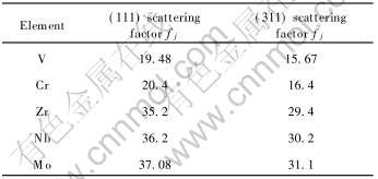 实验所用ZrCr2 Laves相金属间化合物的名义化学成分如表1所示。 根据Laves相化合物晶体结构理论, 以及所添加的合金元素(V、 Nb和Mo)的原子半径和价电子数, 合金元素V和Mo被设计为占据ZrCr2 Laves相中Cr的位置, Nb则是占据ZrCr2 Laves相中Zr的位置。 采用真空电弧炉熔炼, 所用金属原料的纯度(质量分数)分别为Zr 99.99%, Cr 99.7%, Nb、 Mo和V均为99.9%。 为了保证合金化学成分的均匀性, 试样反复熔炼5次; 合金试样进一步在真空退火炉中于1480℃退火8h, 并随炉缓慢冷却至室温。 本文采用Rietveld模拟计算和实验X射线衍射方法测试三元ZrCr2 Laves相的晶格常数, 以及合金化所致ZrCr2衍射峰强度的变化来判断合金元素的晶格占位。 C15结构的Laves相各个晶面的结构因子Fhkl如表2所示。 从表2中可以看出(111)面的结构因子Fhkl与合金元素替代Cr或Zr原子晶格位置最为敏感, 因此可以根据相对衍射强度Ir=I111/I311, 分析合金元素(V、 Nb和Mo)在Laves相中的晶格占位, 相关元素的散射因子列于表3。