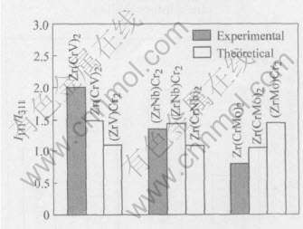 本文进一步采用Rietveld模拟计算和实验X射线衍射谱衍射峰强度的变化来判断合金元素V、 Nb、 Mo的晶格占位。 Rietveld模拟计算的不同化学成分ZrCr2 Laves相金属间化合物的X射线衍射谱如图2所示。 实验和模拟计算得到的相对衍射强度Ir=I111/I311如图3所示。 虽然实验数据与理论计算结果存在误差, 但通过实验得到的相对衍射强度与合金元素V、 Nb、 Mo在不同晶格占位时相对衍射强度理论计算值对比, 同样可以看出Nb原子占据了Zr原子的晶格位置, V和Mo原子则占据Cr原子的晶格位置, 这与上述化合物晶格常数的分析结果一致。