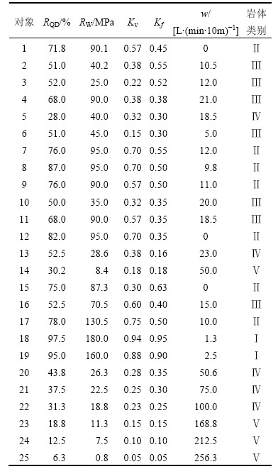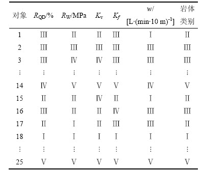 参考有关地下工程岩体质量评价体系[1, 4-5, 16]及获取实际数据难易程度,并且从与岩石质量有关的岩性、岩体结构及地质构造等影响因素出发,选取岩石质量指标(RQD)、岩石单轴饱和抗压强度(RW)、岩体完整性系数(Kv)、结构面强度系数(Kf)和地下水渗水量(w)这5个指标作为影响地下工程岩体质量因素。